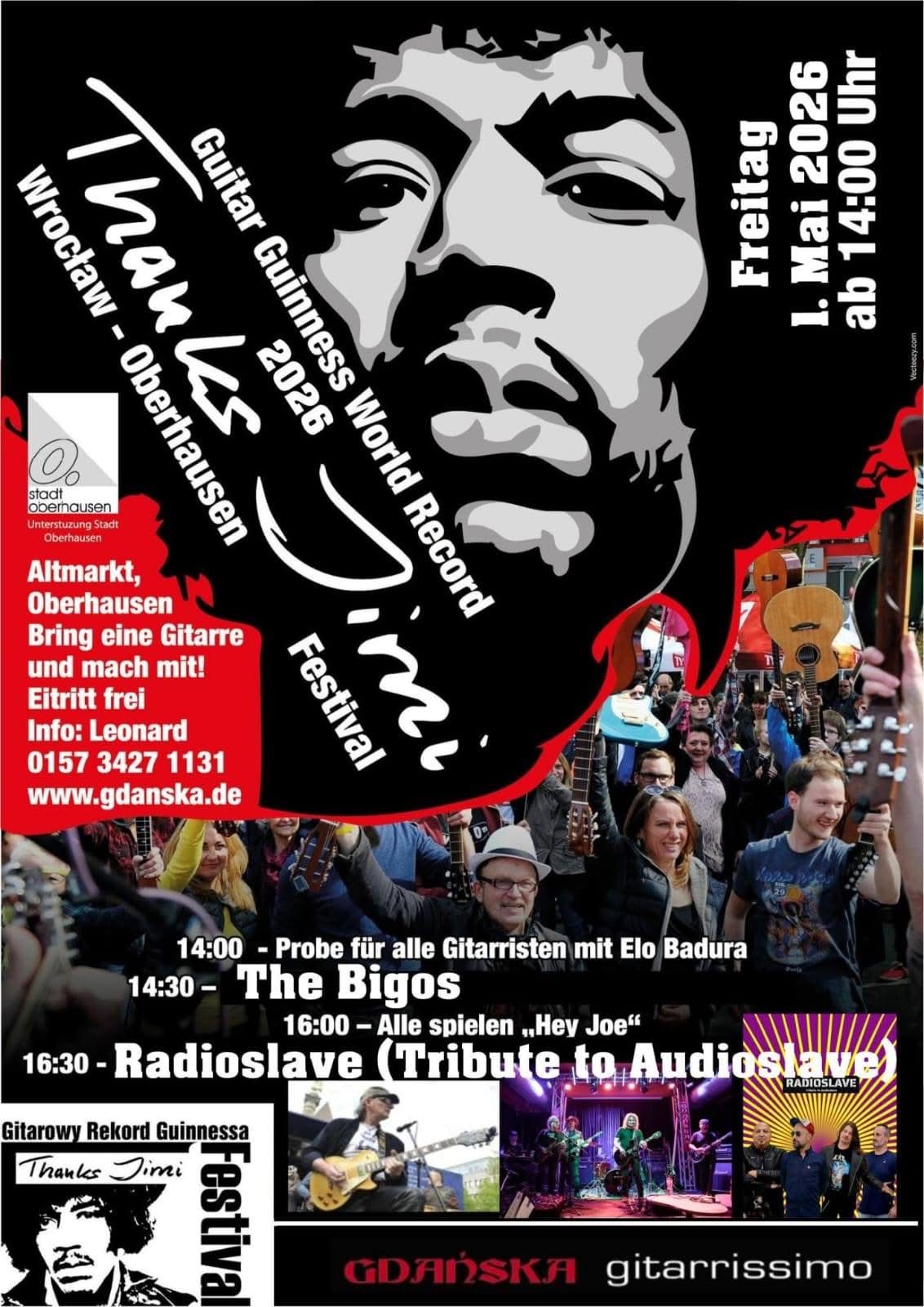 Thanks Jimi Festival – alle spielen „Hey Joe“ von Jimi HendrixWas ist das Thanks Jimi Festival? Wieder einmal huldigen wir zum 1. Mai dem großen Gitarristen Jimi Hendrix und halten ihm zu Ehren ein kostenfreies Open Air Festival am Altmarkt vor dem Gdanska ab. Dabei sind wir nicht allein! Das Thanks Jimi Festival findet parallel in Wroclaw (Breslau) und vielen anderen Städten statt. Um den Meister zu ehren, findet jedes Jahr ein Weltrekordversuch im gleichzeitigen Gitarrenspielen statt. Um 16 Uhr am 1. Mai spielen so viele Gitarristen wie möglich zusammen “Hey Joe”. Wir lassen unsere polnischen Kollegen nicht im Stich und unterstützen das Vorhaben. Alle Oberhausener Gitarristen sind nun aufgerufen, mit ihrer E-Gitarre oder Akustikgitarre am 1. Mai ab 14 Uhr zum Gdanska am Altmarkt zu kommen. Oberhausen – die Stadt der Gitarre! In diesem Jahr auf der Bühne: WIE IMMER – ELO BADURA und: RADIOSLAVE – Audioslave Tribute Band ist eine Band aus Düsseldorf, die einer der legendärsten Bands der 2000er Jahre, AUDIOSLAVE, und insbesondere ihrem verstorbenen Frontmann CHRIS CORNELL huldigt. AUDIOSLAVE, gegründet von Mitgliedern von Rage Against the Machine und Soundgarden, hat mit nur sechs Jahren Bestehen und drei Studioalben ein unauslöschliches musikalisches Vermächtnis in der zeitgenössischen Rockszene hinterlassen. Für alle, die Audioslave mögen, aber nie die Gelegenheit hatten, sie live zu sehen, bringt RADIOSLAVE die Musik dieser Rockband zurück auf die Bühne. RADIOSLAVE wurde 2021 in Düsseldorf spontan geboren, der Zusammenschluss überzeugter Audioslave-Fans, die ihm nach dem Tod von Chris Cornell auf diese Weise Tribut zollen mussten. THE BIGOS ist eine sechsköpfige Rockband aus Hannover, die durch eine gemeinsame Leidenschaft und ein gemeinsames Schicksal im Exil verbunden ist, obwohl sich die Musiker vor ihrer Ausreise aus Polen nicht kannten. Die Band schreibt eigene Songs und interpretiert polnische Klassiker auf ihre eigene Art, wodurch ihre Musik stets ihre Wurzeln widerspiegelt. Ihre Energie lässt die polnische Gemeinde vor Ort den Alltag im Ausland für einen Moment vergessen und sich wie zu Hause fühlen. Ihre Auftritte sind mehr als nur Konzerte – sie schlagen vor allem eine emotionale Brücke zwischen den beiden Ländern durch kraftvollen Rocksound. https://www.gdanska.de/event/thanks-jimi-festival-alle-spielen-hey-joe-von-jimi-hendrix-4/ |