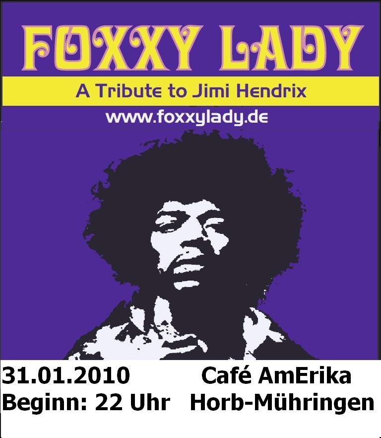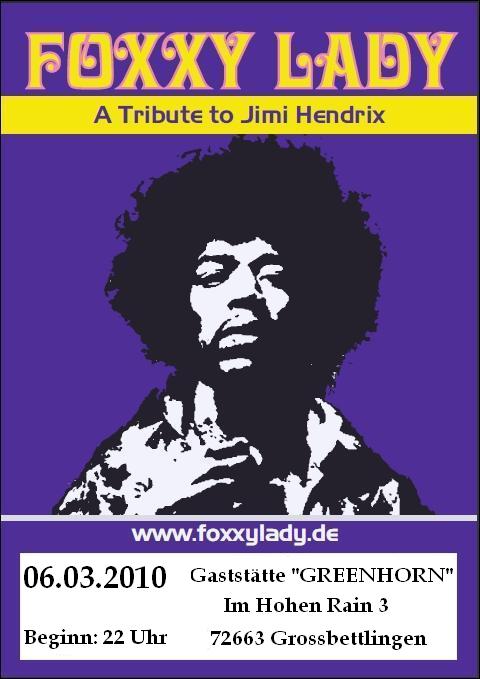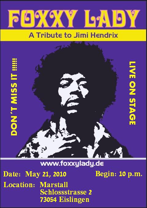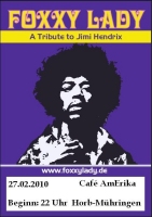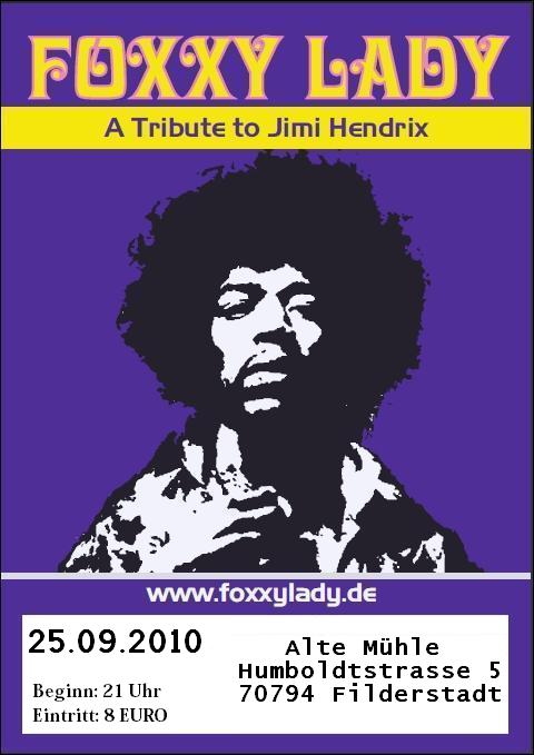 FOXXY LADY - A Tribute to JIMI HENDRIX - LIVE ON STAGE LOVE & PEACE - Party Wann: 27.03.2010 Location: Bistro PIAZA Kirchheimer Str. 92 73249 Wernau Telefon: (07153) 36639 Beginn: 22:00 Uhr FOXXY LADY ist eine Tribute Band, die sich zusammen gefunden hat, um die Musik von Jimi Hendrix zu spielen und zu leben. Da haben sich 3 Musiker gefunden, die das auf der Bühne ausleben, die so fühlen und das auch wirklich rüber bringen. Es ist ein Erlebnis, die 3 auf der Bühne live zu erleben und zu spüren, mit welcher Spielfreude sie an diese Musik herangehen, diese spielen und leben! Das Repertoire besteht überwiegend aus bekannten Songs von Jimi Hendrix wie "Hey Joe", "Little wing", "Foxy Lady" oder "Voodoo Child". Natürlich sind auch Songs dabei, die er nachgespielt hat wie "Like a rolling stone" von Bob Dylan oder "Sunshine of your love" von Cream. Gitarrist und Sänger in der Formation ist Harald Riesterer (Harry). Harry´s Gitarrenspiel ist energetisch, explosiv und wild, er lebt seinen Sound aus, sehr dirty, psychodelisch, funky und kompromisslos...seine Stimme ist eher Rockmässig, rau und hart aber auch sehr warm... Dieudonné Ramilison (Donné) betätigt den Vierseiter und singt im Hintergrund. Donné spielt einen urigen, schmatzenden Groove Rockbass, der wirklich unter die Haut geht... Peter Graber (Pit) ist zuständig fürs Schlagzeug. Pit an den Drums spielt sehr 60ties -70ties mässig, die grooves sind einfach homogen und passen sehr geil zu dieser Mucke... Love & Peace www.foxxylady.de |