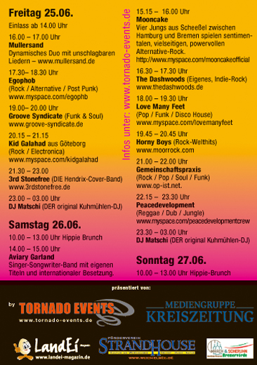 Fehmarn-Festival kann dieses Jahr noch ein letztes Mal stattfinden Kreis und Stadt einigten sich auf Kompriss Eutin/Fehmarn. Das Fehmarn Open Air Festival kann in diesem Jahr noch ein letztes Mal am bisherigen Standort am Flügger Strand stattfinden. Voraussetzung hierfür ist jedoch, dass danach die Fläche als Veranstaltungsort nicht mehr zur Verfügung stehen wird. Auf diesen Kompromiss einigten sich auf Vorschlag von Landrat Reinhard Sager der Kreis Ostholstein und die Stadt Fehmarn nach einem kürzlich stattgefundenen Behördengespräch im Eutiner Kreishaus. Die Stadt Fehmarn wird auf dieser Basis und unter Berücksichtigung der naturschutzrechtlichen Aspekte ab dem nächsten Jahr keine Genehmigungen mehr für Veranstaltungen auf der betroffenen sogenannten "Dreiecksfläche" erteilen. In der neu vorzunehmenden Bauleitplanung durch die Stadt Fehmarn wird die vorliegende Problematik gleichfalls aufzuarbeiten sein. Weitere Infos: http://www.fehmarnfestivalgroup.com/ |